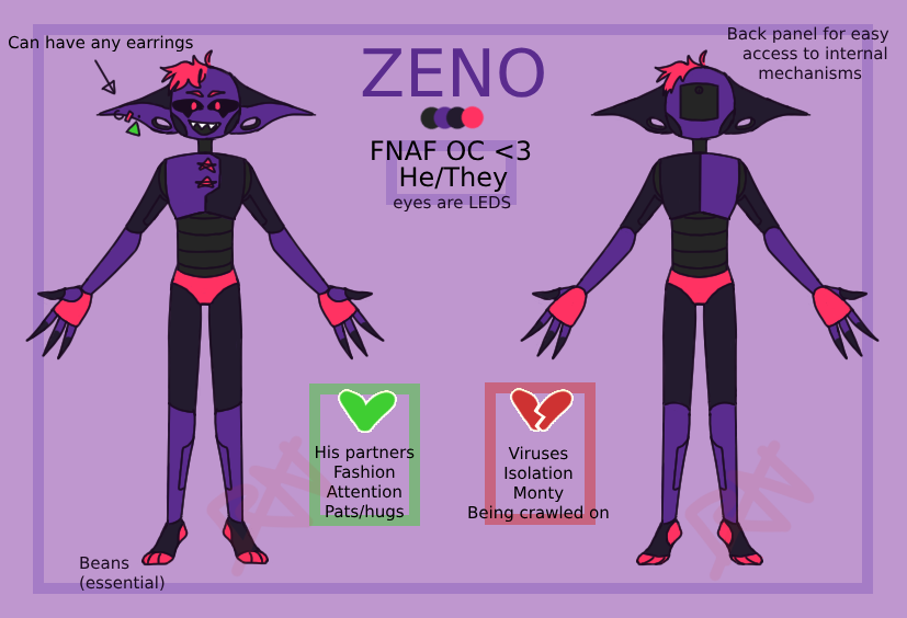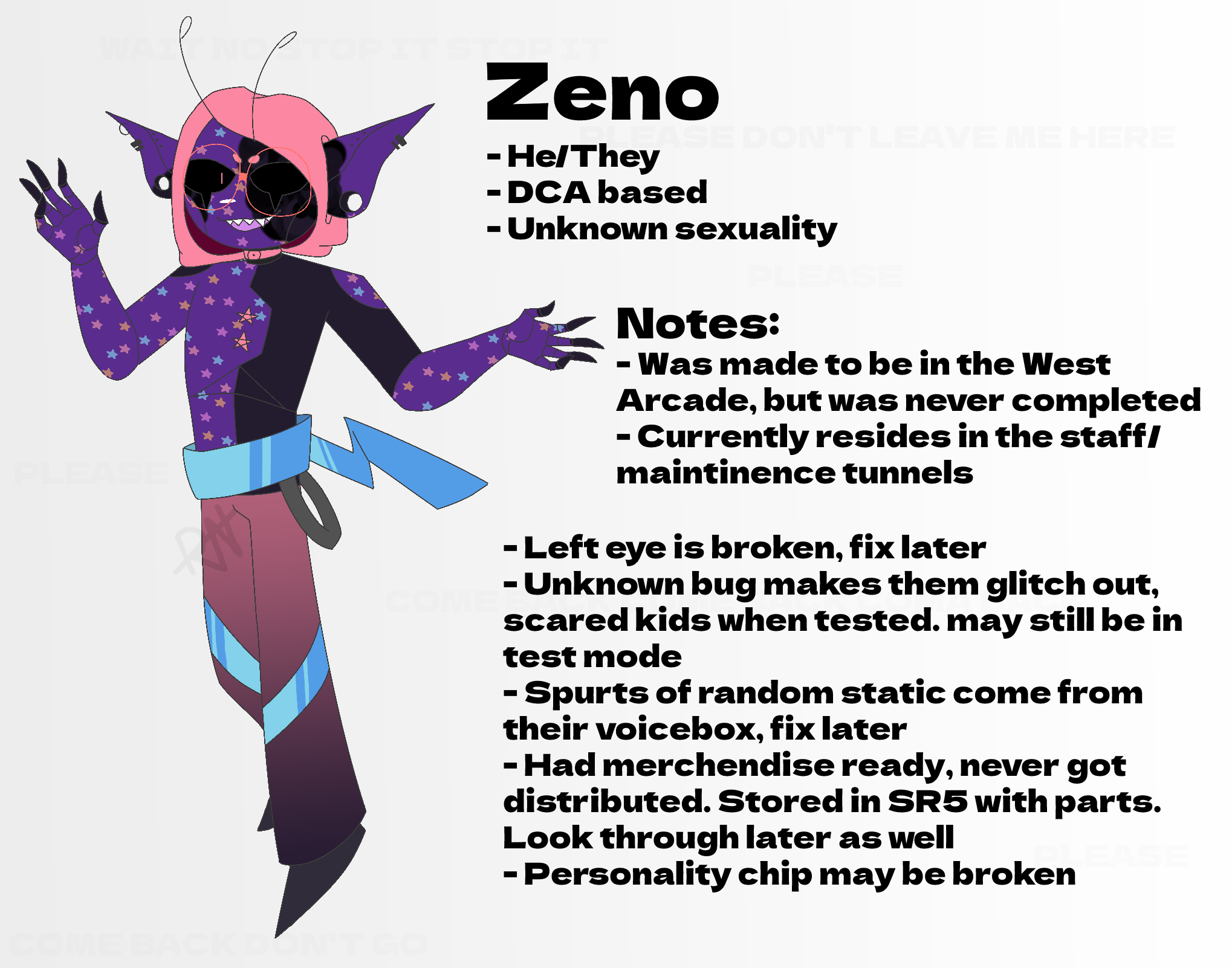 Biography![]() A resident of the west arcade, Zeno is more then happy to give you a second chance on that arcade game he likes. Beat his personal high score and you might get something special like a Zeno plush or something! Either way he loves talking to the kids that play games there, even if it's a little much sometimes. AboutName:ZenoAge:UnknownPronouns:He/TheySex/Gender:MaleOccupation:PerformerSpecies:AnimatronicHeight:6'11"Abilities:NoneRelationsCharacter relationships, whether they're platonic or not. Click the characters to be taken to their pages. ![]() ZenithZeno's favorite. But don't tell zenith that- he doesn't want them to know! He likes to follow them around whenever they're on patrol. Sometimes Zeno will even give Zenith any fazcoins he finds lying around the west arcade.
