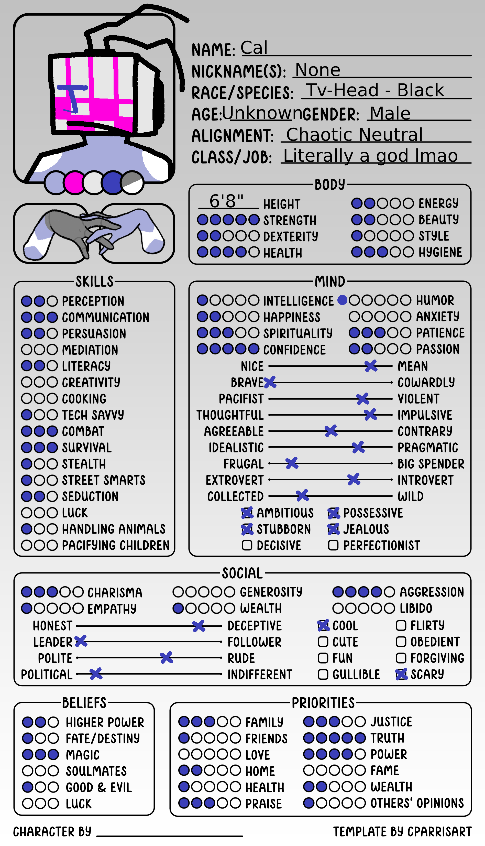 Biography![]() Cal is a very private person, prefering to stick to himself. Although for a good reason, as he is the god of war. His main weapon for combat is typically a large axe, but he may switch it up every now and then for fun. AboutName:CalAge:ImmortalPronouns:He/HimSex/Gender:MaleOccupation:God of WarSpecies:Tv-Head?Height:6'7"Abilities:Can summon his axe, is able to communicate with other gods on a whim.RelationsCharacter relationships, whether they're platonic or not. Click the characters to be taken to their pages. ![]() X-TeeCal's feelings towards X-Tee are very mixed. He's not sure why X-Tee allows him to stick around, but he suspects it's to keep a close eye on him lest he do something possibly threatening.