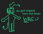 • She has no internal organs, but it's not like she needed them anyways. • She's had her left leg amputated and replaced. Inventory:![]() |